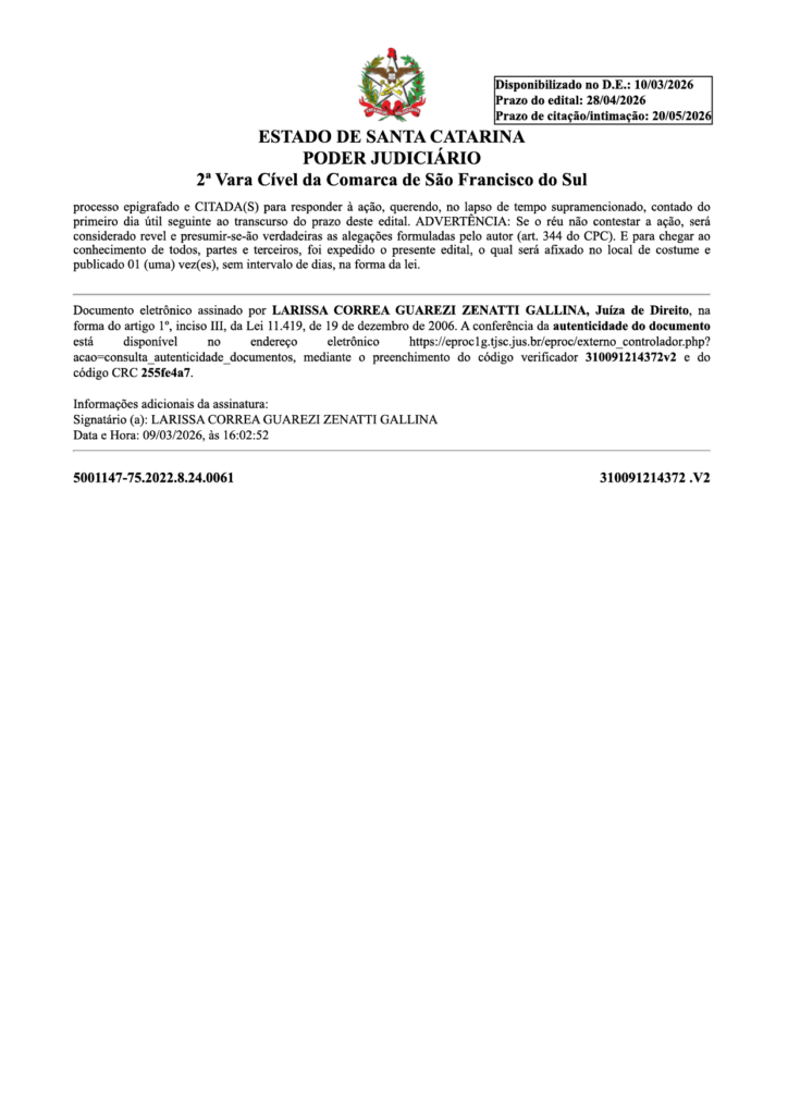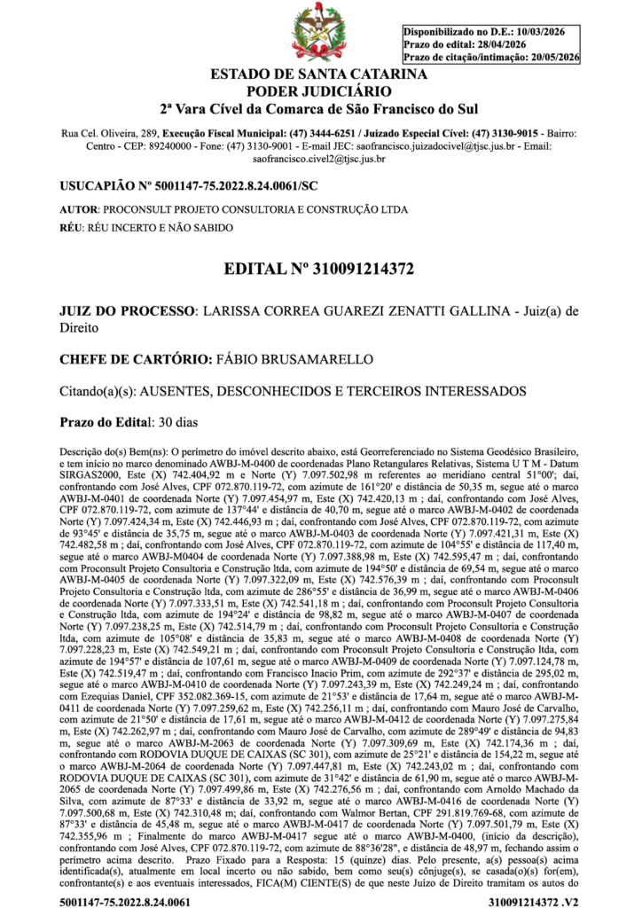 Outras notícias:  Publicação Legal: Usucapião Nº 5003078-16.2022.8.24.0061/SC-02