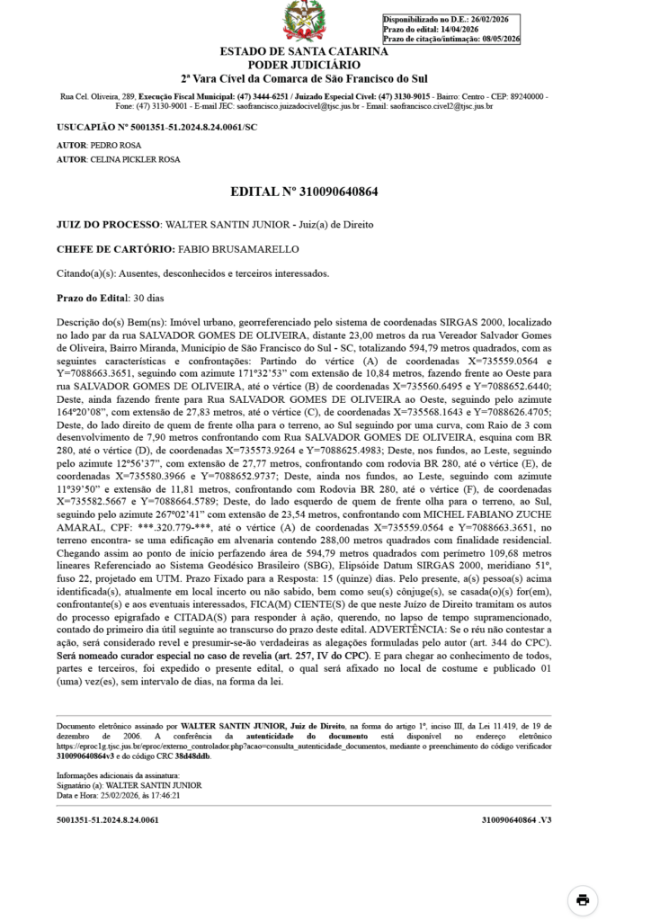 Outras notícias:  Publicação Legal: Usucapião Nº 5004024-17.2024.8.24.0061/SC-02