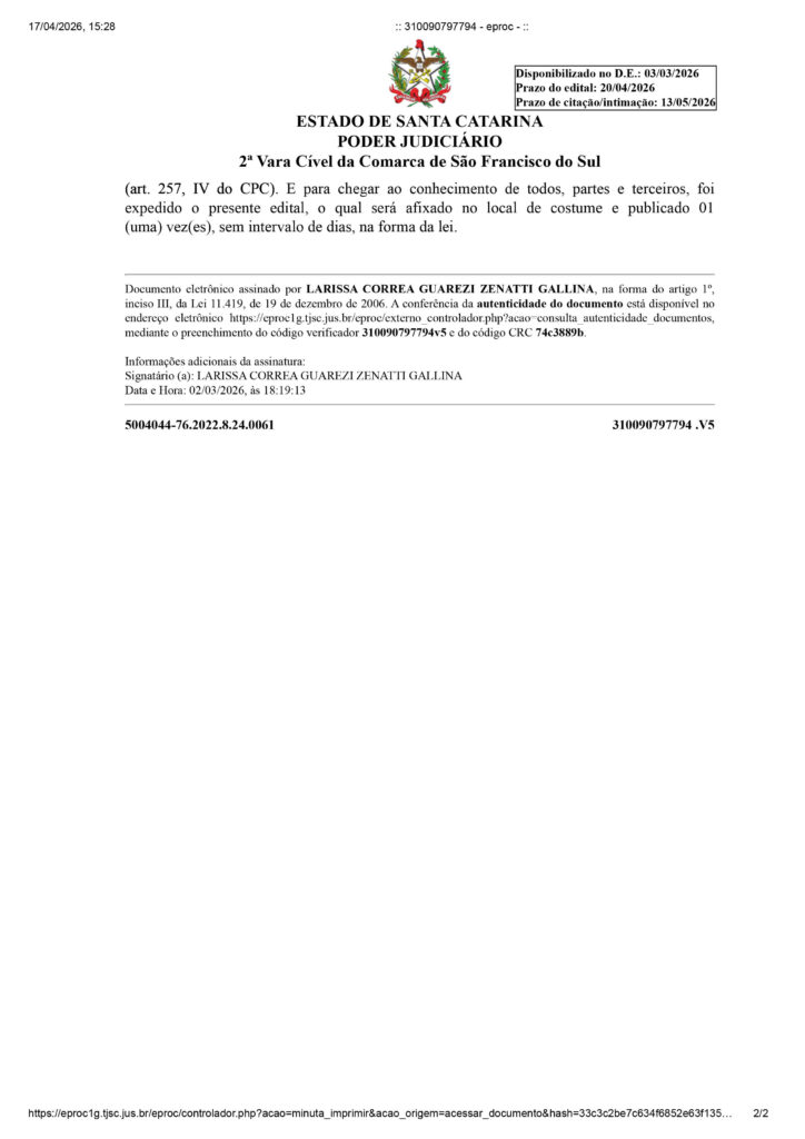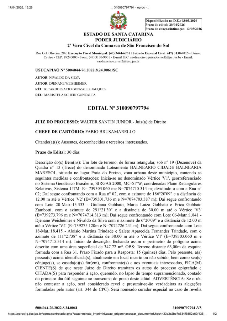 Publicação Legal: Usucapião Nº 5004044-76.2022.8.24.0061/SC-01