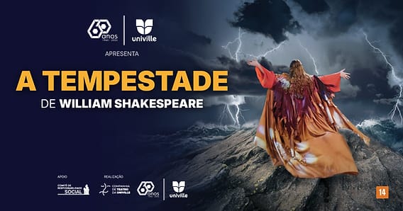 Considerada uma das grandes obras de Shakespeare e a última que ele escreveu sozinho, A Tempestade tece uma narrativa sobre poder, liberdade, vingança, perdão e redenção — temas universais que seguem urgentes e atuais. A montagem da Univille traz uma leitura diferenciada: o protagonista Próspero torna-se Próspera, uma figura feminina exilada em uma ilha com sua filha, que domina a magia e a alquimia para confrontar seus traidores.